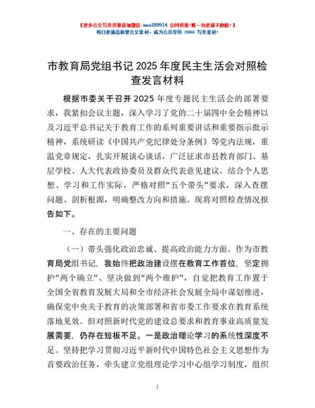 / 市教育局党组书记2025年度民主生活会对照检查发言材料