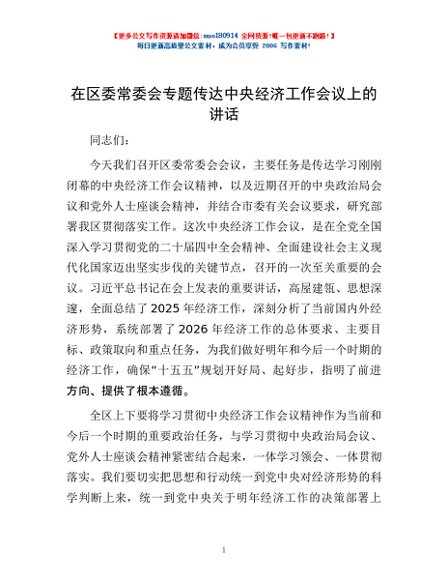 / 在区委常委会专题传达中央经济工作会议上的讲话