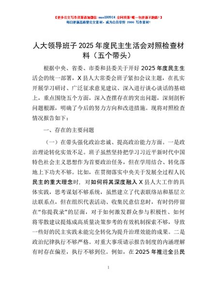 / 人大领导班子2025年度民主生活会对照检查材料(五个带头)