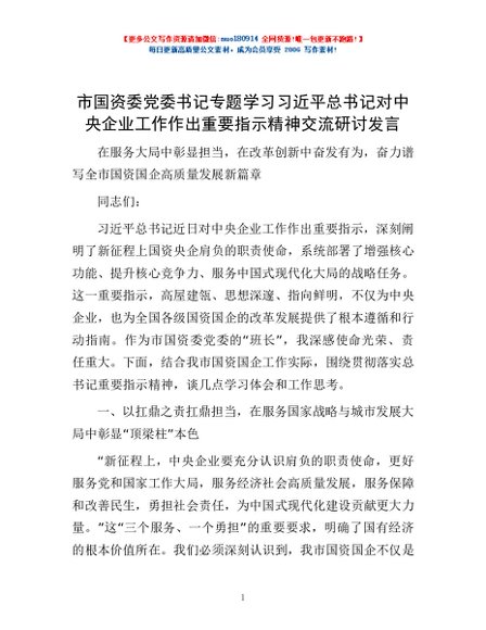 / 市国资委党委书记专题学习习近平总书记对中央企业工作作出重要指示精神交流研讨发言