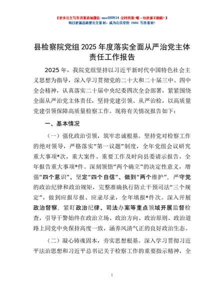 / 县检察院党组2025年度落实全面从严治党主体责任工作报告