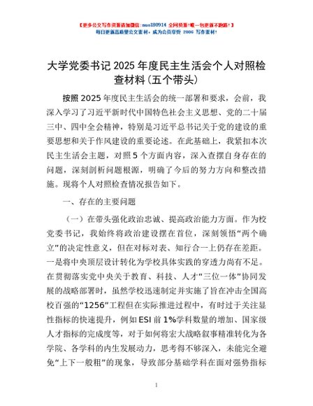 / 大学党委书记2025年度民主生活会个人对照检查材料(五个带头)