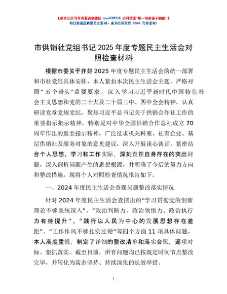 / 市供销社党组书记2025年度专题民主生活会对照检查材料