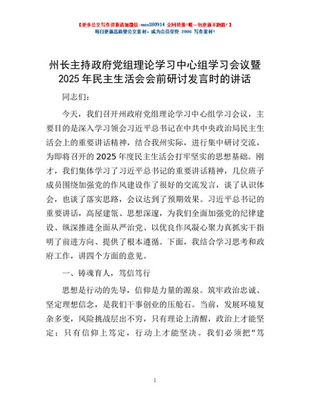 / 州长主持政府党组理论学习中心组学习会议暨2025年民主生活会会前研讨发言时的讲话