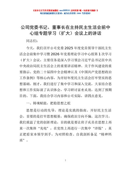 / 公司党委书记、董事长在主持民主生活会前中心组专题学习(扩大)会议上的讲话