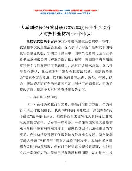 / 大学副校长(分管科研)2025年度民主生活会个人对照检查材料(五个带头)