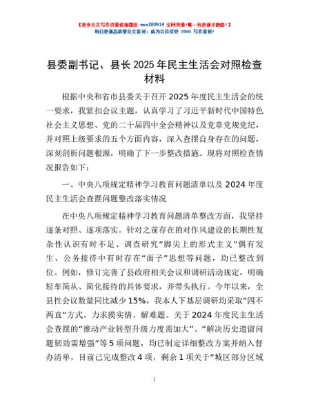 / 县委副书记、县长2025年民主生活会对照检查材料