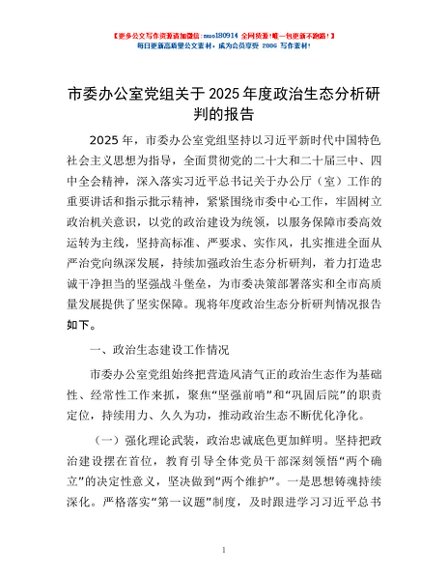 / 市委办公室党组关于2025年度政治生态分析研判的报告