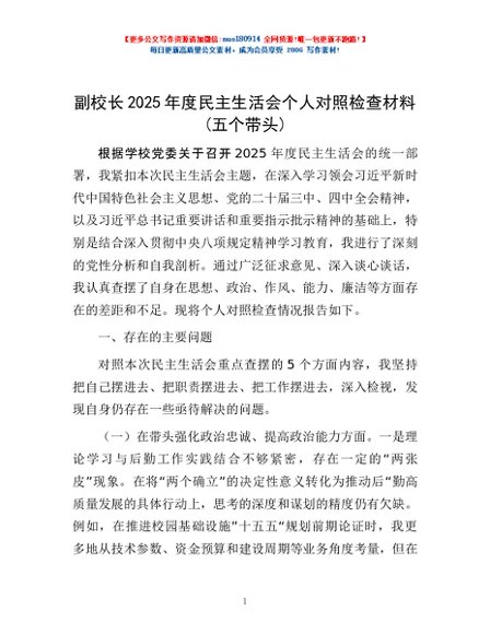 / 副校长2025年度民主生活会个人对照检查材料(五个带头)