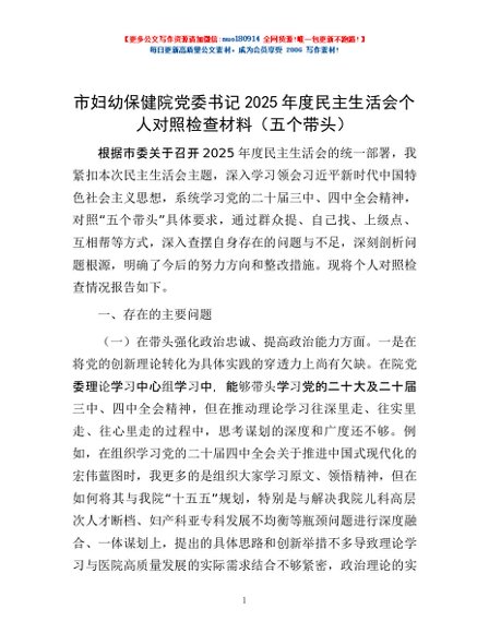 / 市妇幼保健院党委书记2025年度民主生活会个人对照检查材料(五个带头)