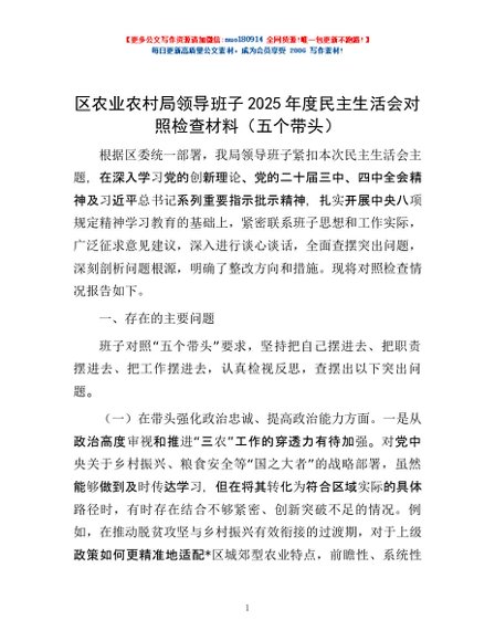/ 区农业农村局领导班子2025年度民主生活会对照检查材料(五个带头)