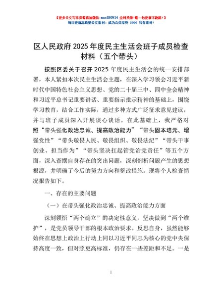 / 区人民政府2025年度民主生活会班子成员检查材料(五个带头)