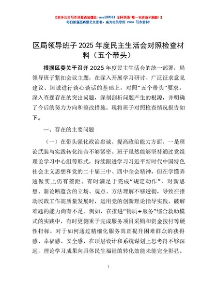 / 区局领导班子2025年度民主生活会对照检查材料(五个带头)