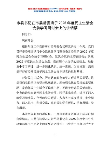 / 市委书记在市委常委班子2025年度民主生活会会前学习研讨会上的讲话稿