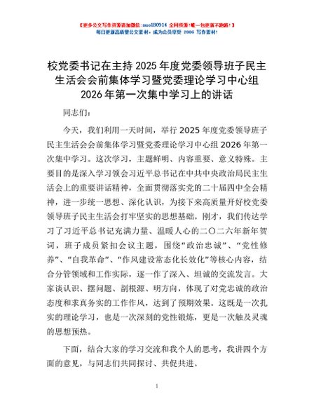 / 校党委书记在主持2025年度党委领导班子民主生活会会前集体学习暨党委理论学习中心组2026年第一次集中学习上的讲话