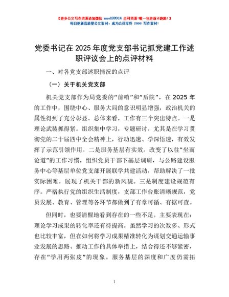 / 党委书记在2025年度党支部书记抓党建工作述职评议会上的点评材料