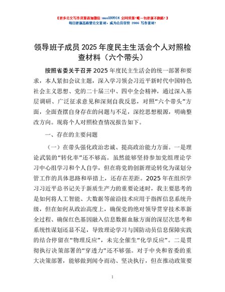 / 领导班子成员2025年度民主生活会个人对照检查材料(六个带头)