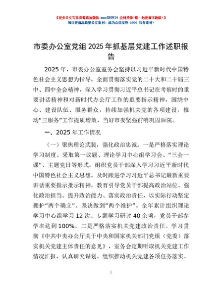 / 市委办公室党组2025年抓基层党建工作述职报告