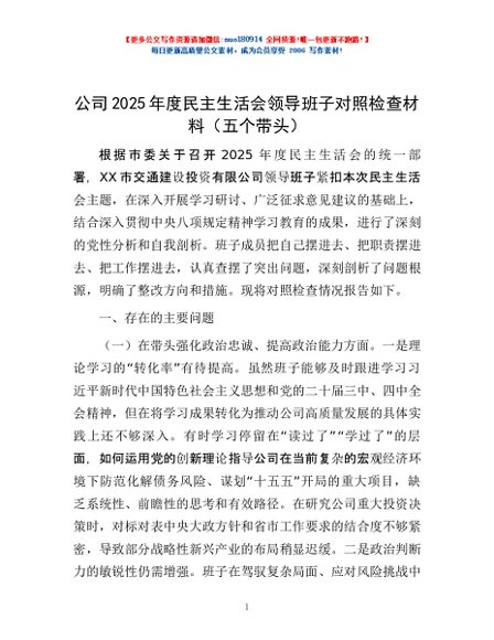 / 公司2025年度民主生活会领导班子对照检查材料(五个带头)