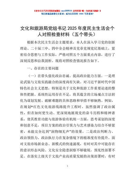 / 文化和旅游局党组书记2025年度民主生活会个人对照检查材料(五个带头)