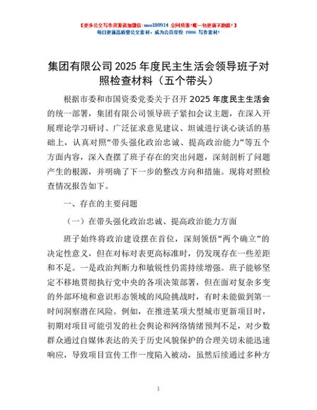 / 集团有限公司2025年度民主生活会领导班子对照检查材料(五个带头)