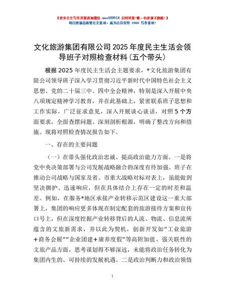 / 文化旅游集团有限公司2025年度民主生活会领导班子对照检查材料(五个带头)