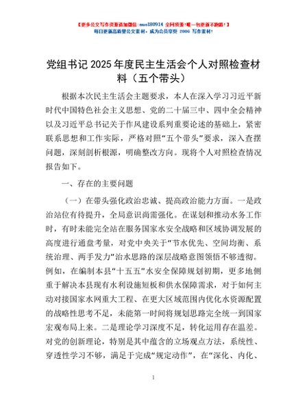 / 党组书记2025年度民主生活会个人对照检查材料(五个带头)