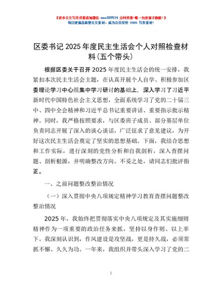 / 区委书记2025年度民主生活会个人对照检查材料(五个带头)