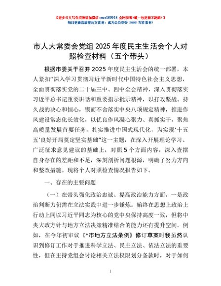 / 市人大常委会党组2025年度民主生活会个人对照检查材料(五个带头)