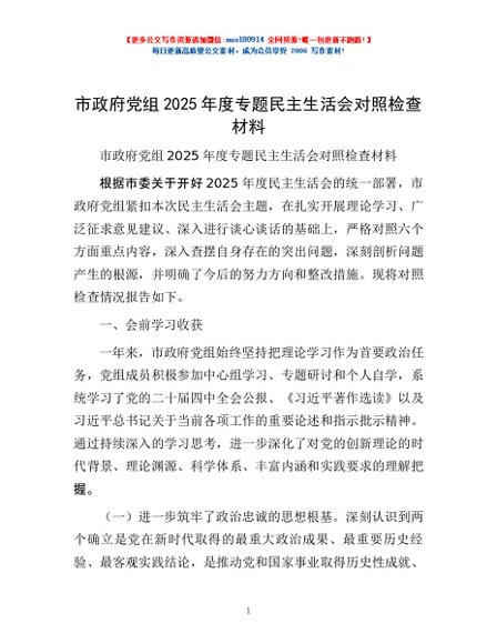 / 市政府党组2025年度专题民主生活会对照检查材料