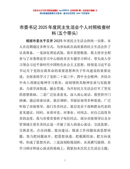 / 市委书记2025年度民主生活会个人对照检查材料(五个带头)