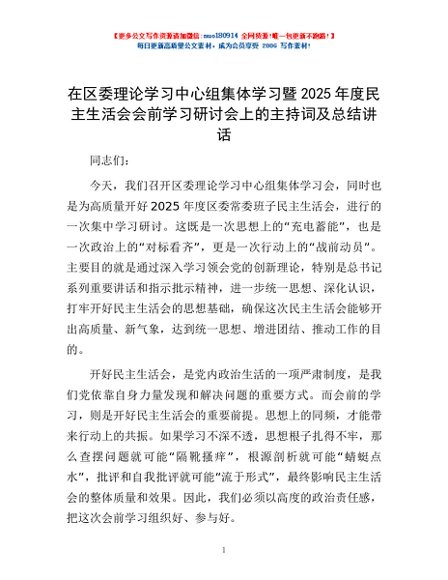 / 在区委理论学习中心组集体学习暨2025年度民主生活会会前学习研讨会上的主持词及总结讲话
