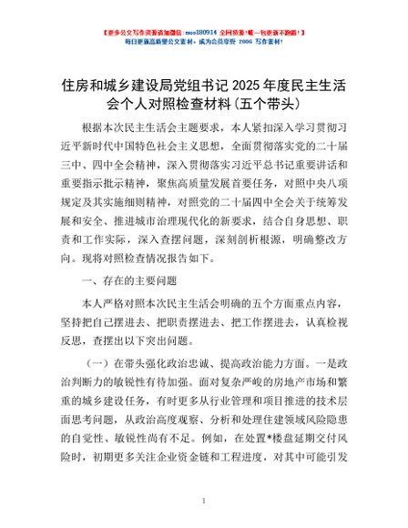 / 住房和城乡建设局党组书记2025年度民主生活会个人对照检查材料(五个带头)