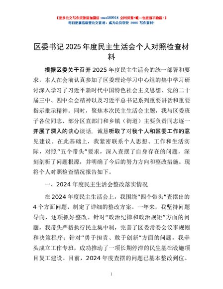 / 区委书记2025年度民主生活会个人对照检查材料