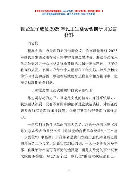 / 国企班子成员2025年民主生活会会前研讨发言材料
