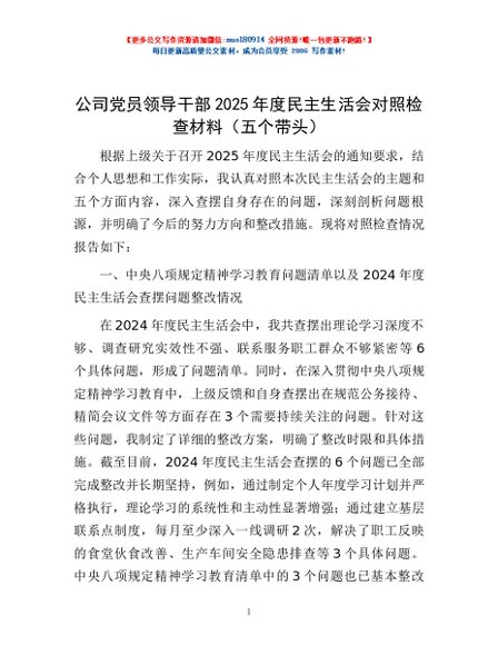 / 公司党员领导干部2025年度民主生活会对照检查材料(五个带头)