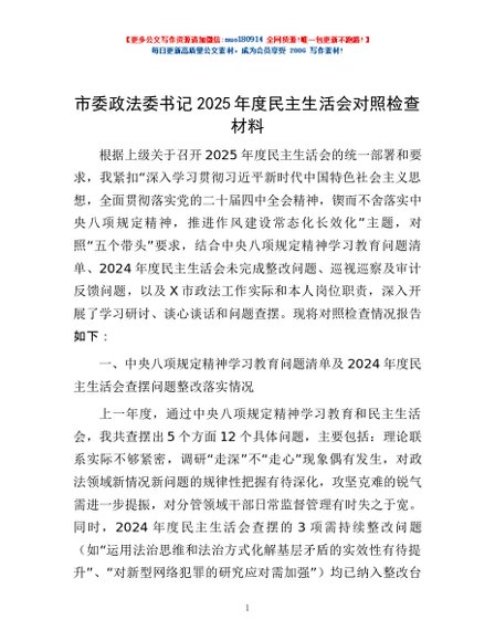 / 市委政法委书记2025年度民主生活会对照检查材料