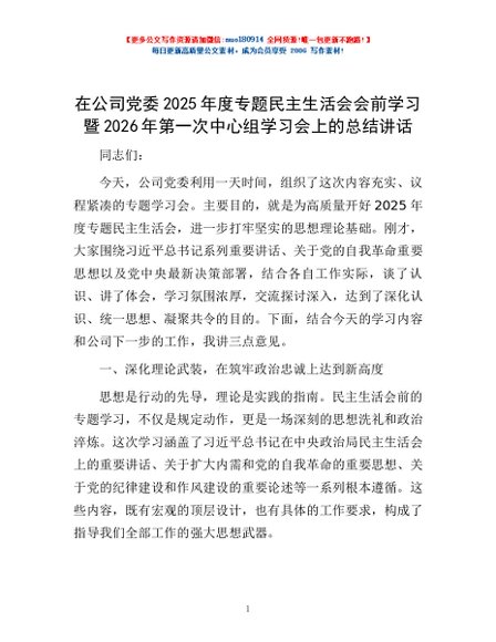 / 在公司党委2025年度专题民主生活会会前学习暨2026年第一次中心组学习会上的总结讲话