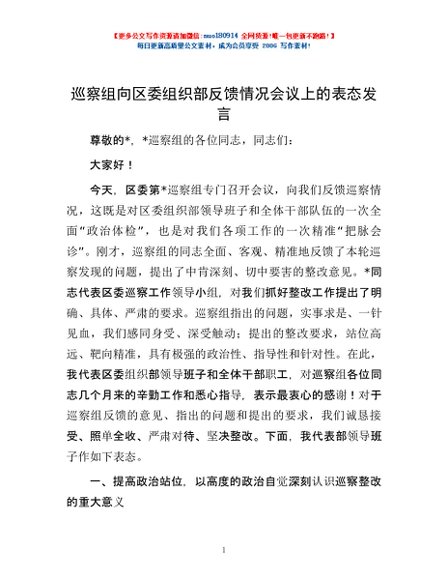 / 巡察组向区委组织部反馈情况会议上的表态发言