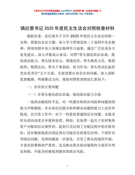 / 镇纪委书记2025年度民主生活会对照检查材料