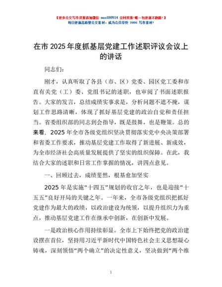 / 在市2025年度抓基层党建工作述职评议会议上的讲话