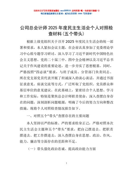 / 公司总会计师2025年度民主生活会个人对照检查材料(五个带头)