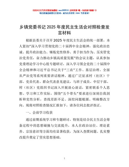 / 乡镇党委书记2025年度民主生活会对照检查发言材料