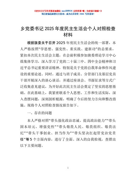/ 乡党委书记2025年度民主生活会个人对照检查材料