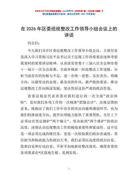 / 在2026年区委巡视整改工作领导小组会议上的讲话