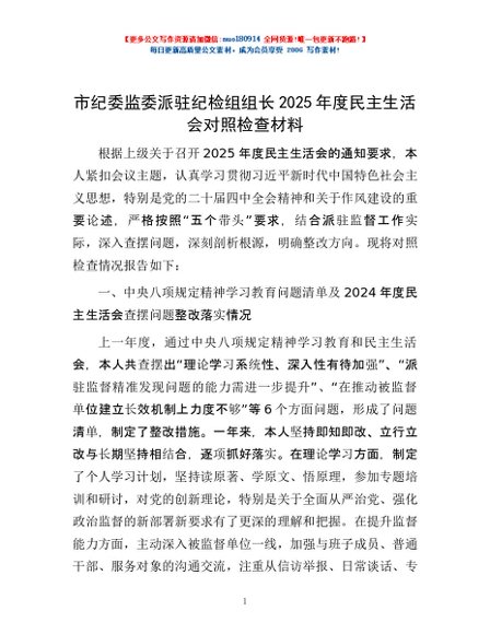 / 市纪委监委派驻纪检组组长2025年度民主生活会对照检查材料