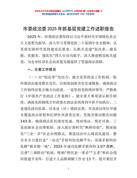 / 市委政法委2025年抓基层党建工作述职报告