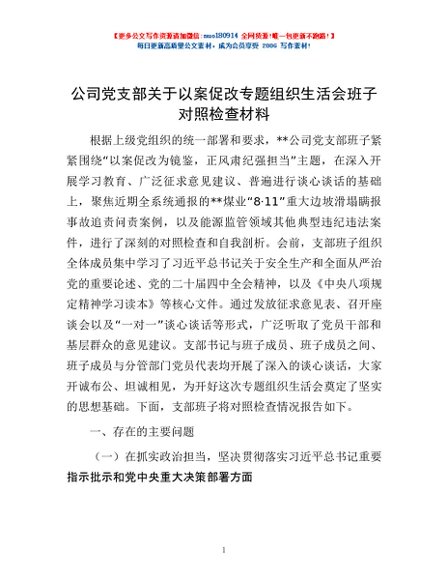/ 公司党支部关于以案促改专题组织生活会班子对照检查材料