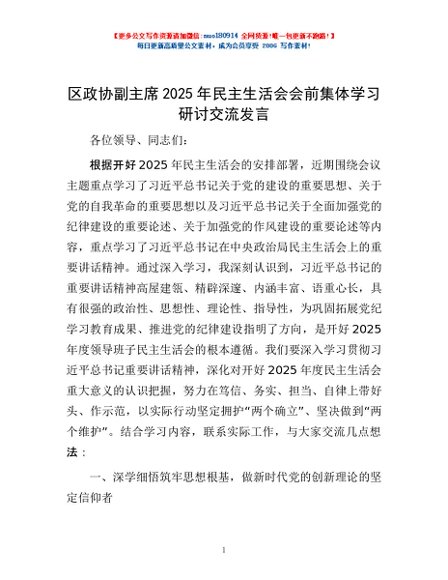 / 区政协副主席2025年民主生活会会前集体学习研讨交流发言
