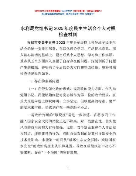 / 水利局党组书记2025年度民主生活会个人对照检查材料